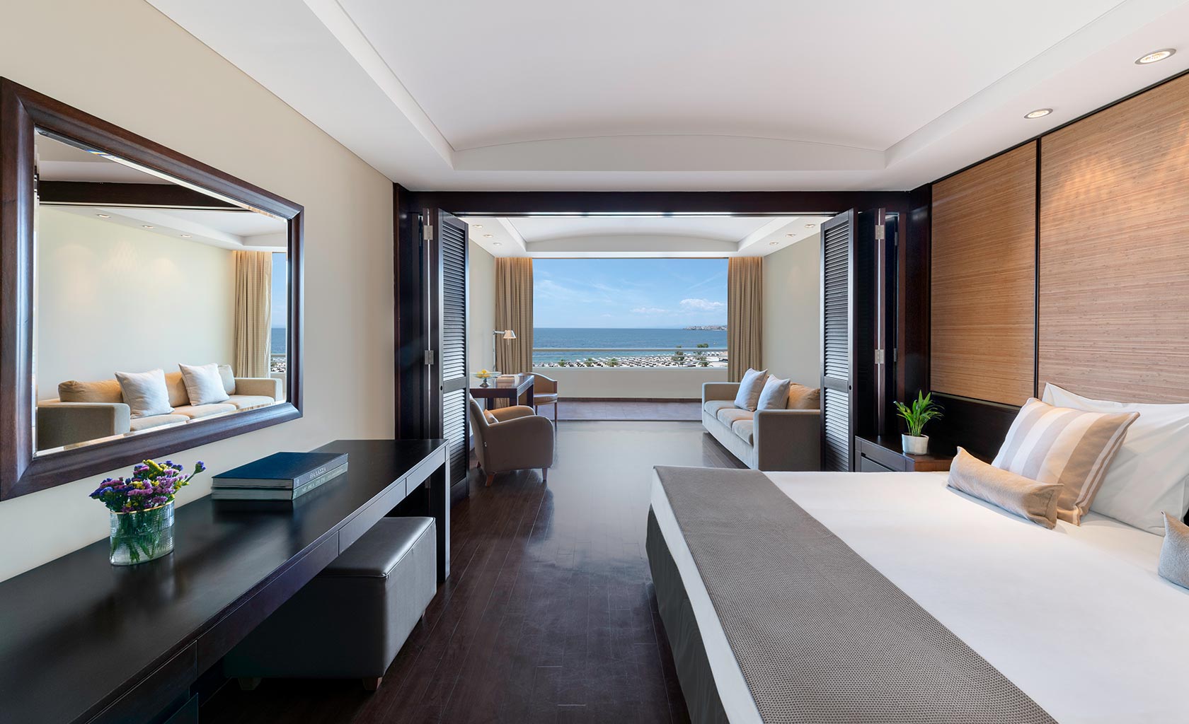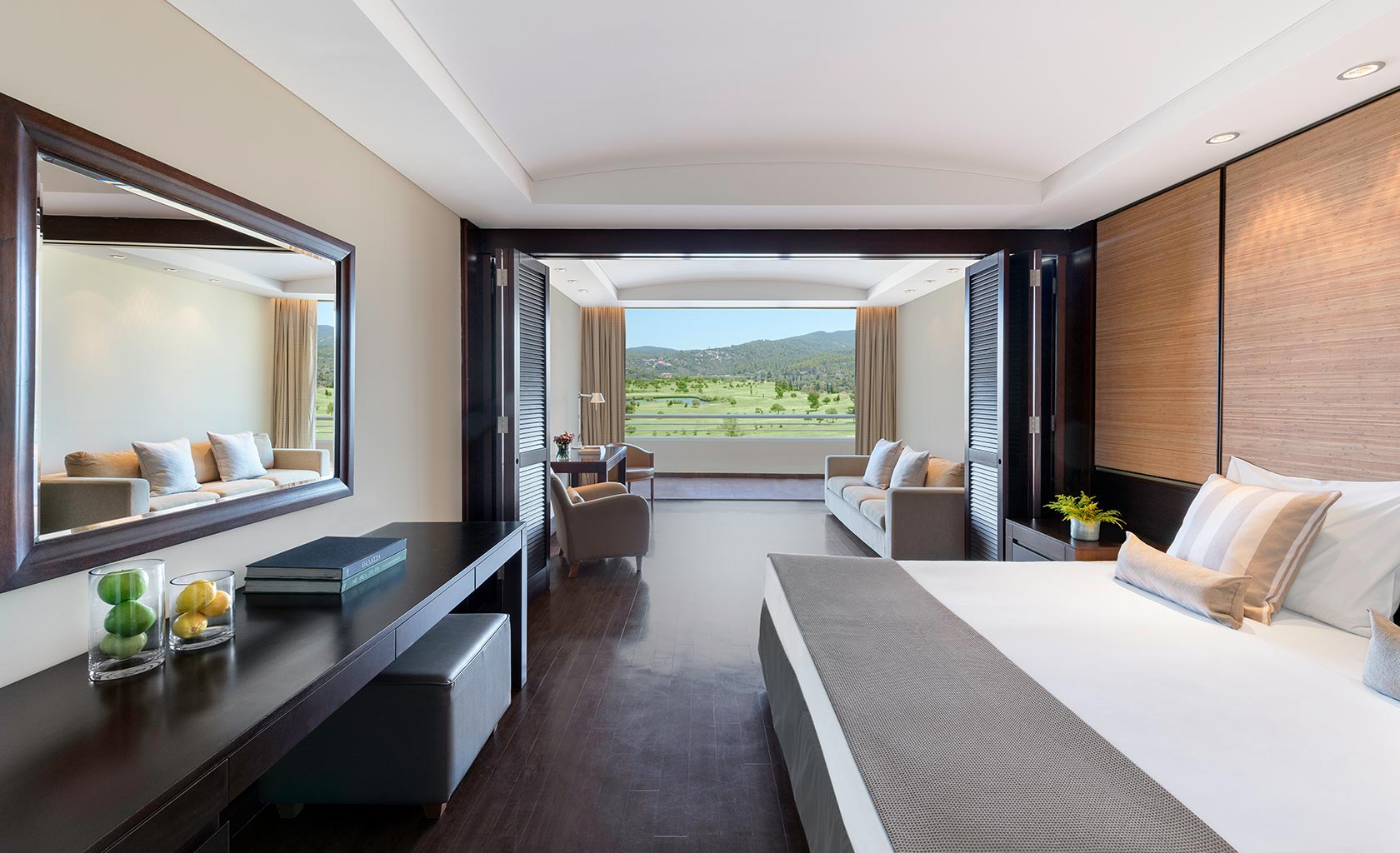 A convenient and spacious layout, with a generously sized bedroom that includes a double bed and a single sofa bed, an elegant open-plan living room with an elegant sitting corner separated by sliding louvers, a view of sea or the landscaped golf course from the furnished balcony, and an en suite marble bathroom with tub.